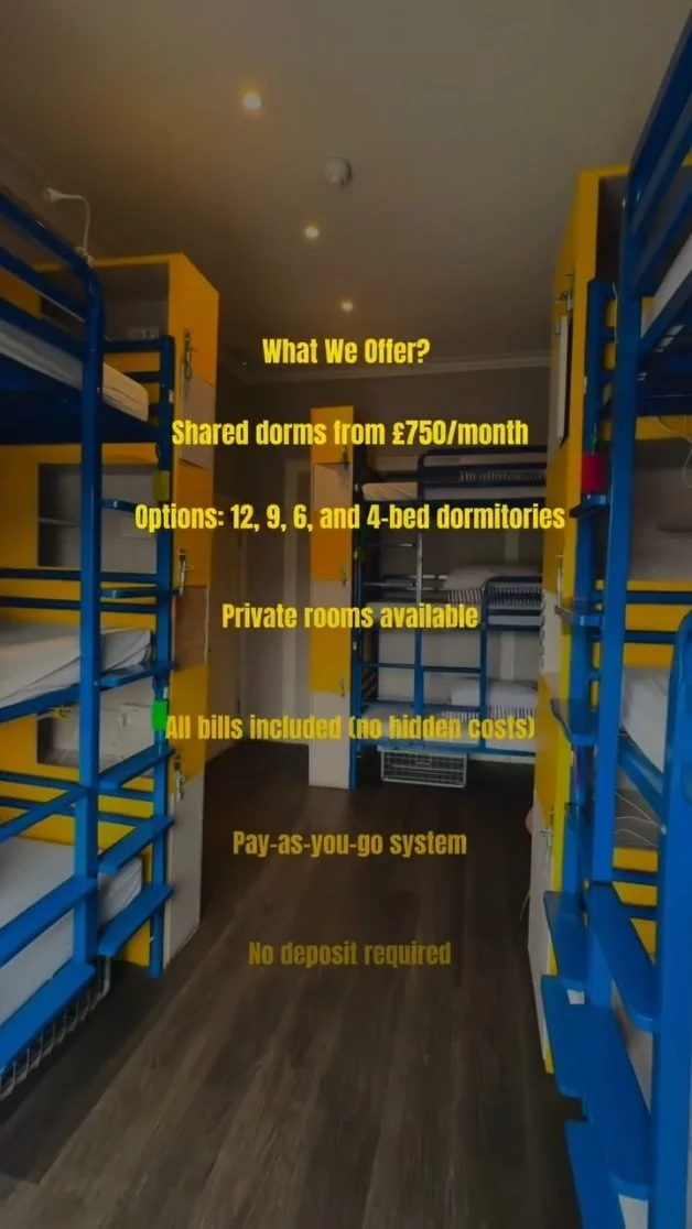 We have a mixture of private rooms and dorm rooms, all with plug points next to each bed, and high speed internet throughout the building. Each room comes with storage options for your belongings, and there are laundry facilities for you to use too.